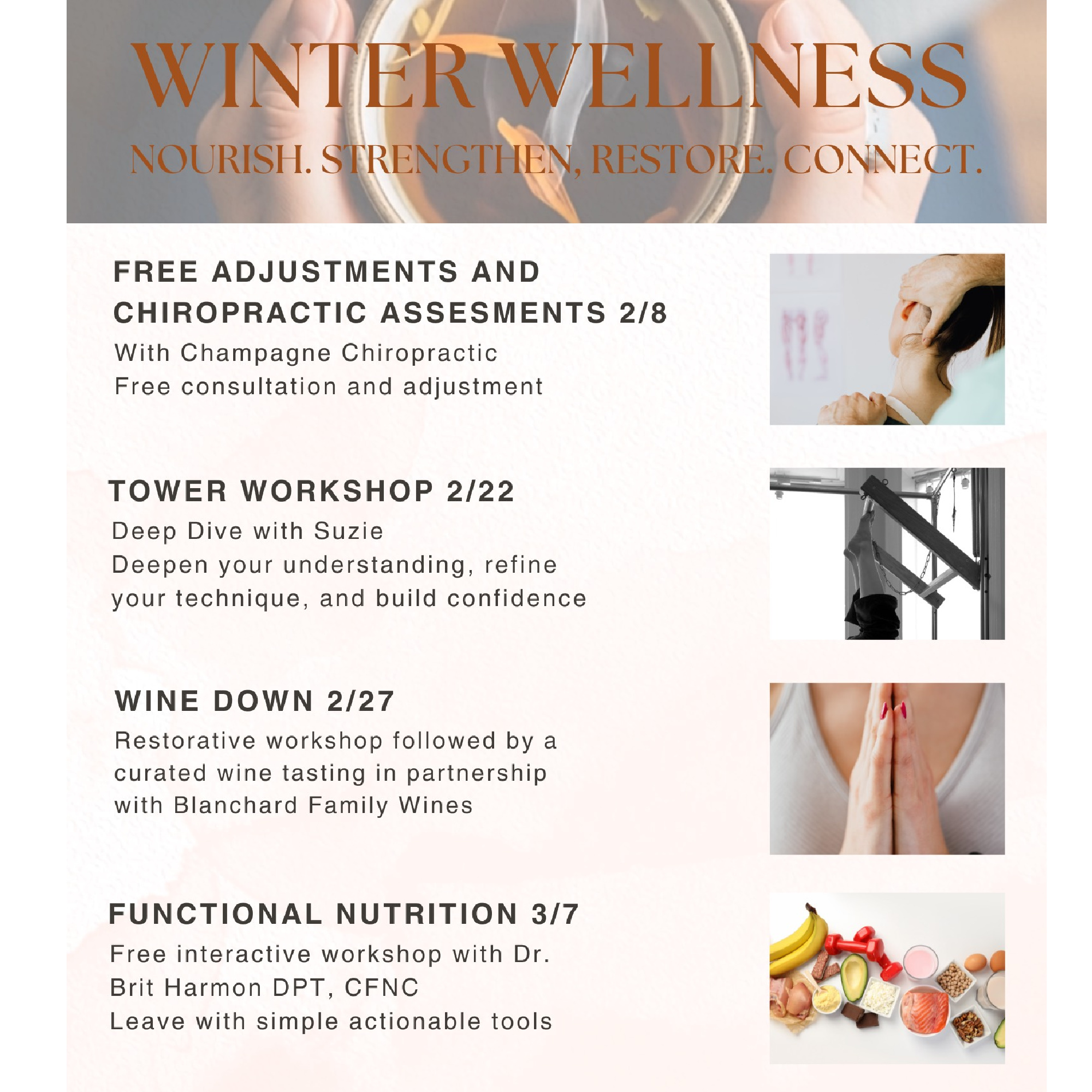 CHIROPRACTIC ADJUSTMENTS & ASSESSMENTS Sunday, Feb. 8th (9:30a-10:30a) Free event, email the studio to reserve a spot (10 min. appointments) info@axispilates.com TOWER WORKSHOP Sunday, Feb. 22nd (8:00a-10:00a) Only 4 clients max. (Cost: $50) Reserve Your Spot HERE WINE DOWN Friday Feb. 27th (5:00p-7:00p) 12 clients max (Cost $49 – Sign up before 2/20 & get […]